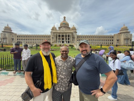 In der Wohnung angekommen, hat seine Frau uns ein paar Früchte und etwas zu trinken angeboten, seine 9jährige Tochter, hat uns auf ihrer Geige vorgespielt und etwas vorgetanzt. Anschließen hat uns Vijay, so der Name unseres neuen Freundes, mit seinem Auto zu einem kleinen Restaurant gebracht, wo wir ein traditionelles Frühstück und einen typisch südindischen Kaffee bekommen haben. Wir durften nicht bezahlen und wurden eingeladen! Anschließend hat er uns noch zum Sri Govardhana Kshetra Tempel gebracht, einem Tempel in einer künstlichen Felsenhöhle. Danach sind wir mit ihm zum Vidhana Soudha gefahren, dem Senatsgebäude des Bundesstaates Karnataka. Vijay hat auch noch eine Fahrt mit einem Tuktuk durch das Regierungsviertel organisiert und wieder für uns bezahlt! Danach hat er uns mit seinem Auto zurück zu unserem Hotel gebracht. Um 14 Uhr haben wir uns dann mit Prashant getroffen, den wir auf unserer letzten Reise kennengelernt haben und der eigentlich aus Chandigarh stammt, jedoch vor wenigen Monaten nach Bengaluru umzogen ist. Mit ihm haben wir den Cobbon Park besucht, und haben dann zu Abend gegessen. Auch diesmal war es uns nicht erlaubt zu bezahlen. Wir sind immer wieder über die äusserst großzügige Gastfreundschaft der Inder erstaunt! ![]() |