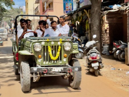 Heute gehört der Palast der Wadiyar Dynastie und ist offenes Museum, Veranstaltungsort und beliebtes Touristenziel, dessen Säle, Gärten und Architektur, Besucher in die königliche Vergangenheit von Mysore entführen. Da der Palast gerade für eine bevorstehende Hochzeitsfeier geschmückt wurde, haben wir auf einen Besuch im Inneren verzichtet und sind gleich zu einem großen Markt ins Stadtzentrum zurück gefahren und am Nachmittag dann zurück ins Hotel, um uns etwas vom vielen Laufen bei sonnigen 30 Grad Celsius auszuruhen. Als wir am Abend nochmals rausfahren wollten, wurden wir von einem kurzen, aber heftigen Wolkenbruch überrascht. Wir haben uns in ein kleines Restaurant geflüchtet, ein schnelles Abendessen konsumiert und sind, nachdem der Regen wieder aufgehört hatte, wieder zurück ins Hotel. Vor dem Hotel haben uns zwei junge Männer angesprochen, die gerade mit einem Motorrad vorgefahren waren und wollten uns unbedingt auf eine Tasse Chai am gegenüberliegenden Verkaufsstand einladen. Sie haben uns erzählt, dass sie als Jockeys auf der nahegelegen Pferderennbahn arbeiten. Sie haben uns eingeladen, sie dort morgen Früh zu besuchen... wir sind gespannt! ![]() |