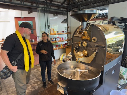 Unser zweiter Tag in Madikeri stand ganz im Zeichen des Kaffees. Allerdings waren wir heute schon sehr früh auf, so dass die meisten Geschäfte noch geschlossen hatten, als wir schon auf der Straße waren. Wir nutzten also die Zeit mit einem ausgedehnten Spaziergang durch die Stadt und besichtigten ein paar interessante Plätze direkt am Ort. Erste Station war das Madikeri Fort, oder auch Mercara Fort genannt, das man einfach so betreten und einmal um die Befestigungsmauer herumlaufen kann. Das Fort stammt aus der zweiten Hälfte des 17ten Jahrhunderts, wurde später mehrfach umgebaut und erweitert. In der Kirche befindet sich ein Museum, das allerdings am Morgen noch geschlossen war. Als nächstes besuchten wir den Sri Omkareshwara Temple. Der Tempel wurde im 18. Jahrhundert von König Lingarajendra II. erbaut. Der Legende nach tötete der König einen Brahmanen, um seine politischen Ambitionen zu verwirklichen. Dies hatte jedoch negative Auswirkungen auf ihn: Der König wurde von Albträumen heimgesucht und suchte den Rat einiger weiser Männer, um davon befreit zu werden. Ihrem Rat zufolge erbaute der König einen Tempel für Gott Shiva. Dies beendete die Albträume des Königs. Danach haben wir uns mit einem Tuktuk zum etwas 7 km ausserhalb gelegen „Big Cup Café“ bringen lassen, einem sehr modernen Kaffeehaus mit integrierter Kaffeerösterei auf höchstem Niveau. Wir hatten ein sehr ausführliches Gespräch mit der jungen Röstmeisterin und ihren Kollegen, es wurde uns alles in dem Betrieb gezeigt und wir durften beim Rösten zuschauen. Das Frühstück und der Kaffee waren ausserdem auch noch hervorragend. |