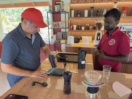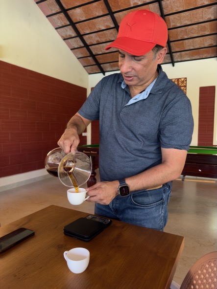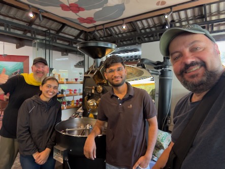 Danach ging es nochmals ein paar Kilometer ausserhalb der Stadt zur Kaffeeplantage „Sandalkad Estates“. Da wir an dem heutigen Vormittag offensichtlich die einzigen Besucher dort waren, machte einer der Mitarbeiter mit uns alleine eine etwa einstündige Führung über das Plantagengelände, zeigte uns die Kaffepflanzen, Gewürzpflanzen und die technischen Geräte zum Aufbereiten der Kaffeekirschen etc. Ein Jeep brachte uns am Ende der Führung zurück zum Hauptgebäude, wo wir zufällig auf den Besitzer der Plantage, Shamveel Nizam, stießen. Dort realisierten wir, dass er auch der Eigentümer vom „Big Cup Café“ ist und dort der Kaffee von seiner Plantage geröstet und ausgeschenkt wird. Auch mit ihm hatten wir ein sehr informatives Gespräch und er hat sich viel Zeit für uns genommen und uns persönlich eine besondere Kaffeerarität von Hand gemahlen und von Hand aufgebrüht! Am Abend haben wir dann in einem Reisebüro noch ein Auto für unsere Fahrt übermorgen von Madikeri nach Kochi gebucht und sind zum Abendessen gegangen. Auf dem Weg zurück zum Hotel hat uns eine Gruppe von Studenten aus Maharashtra angesprochen, die auch gerade in Südindien herumreisen. Wir hatten ein nettes Gespräch, mussten Kontakten austauschen und die obligatorischen Fotos machen! ![]() |