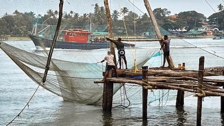 Unweit von der Franziskanerkirche findet man die sogenannten Chinesischen Fischernetze am Strand von Kochi. Große mechanische Vorrichtungen aus hölzernen Stangen halten horizontale Netze von 20 Metern Durchmesser oder mehr, jede Anlage ist mindestens 10 Meter hoch. Schwere Steine sind an Seilen am anderen Ende als Gegengewichte aufgehängt. Jede Anlage wird von einem Team von bis zu sechs Fischern betrieben.