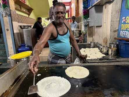 Ein Nachtrag zum gestrigen Abend: Nachdem wir unseren gestrigen Bericht hochgeladen hatte, sind wir nochmals rausgegangen, um etwas zu essen. Wir hatten keine Ahnung, wie sich der Abend dann noch entwickeln würde. Zunächst waren wir in einem kleinen Lokal, gleich um die Ecke unseres Hotels. Die Mitarbeiter dort waren sehr lustig und haben uns einfach aufgetischt, was die Küche hergab. Wir hatten keine Auswahlmöglichkeit, es gab Idli mit Sambar und Dosa mit Sambar und Chutney. | ![]() |