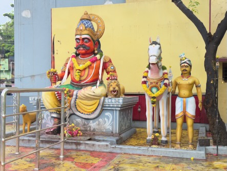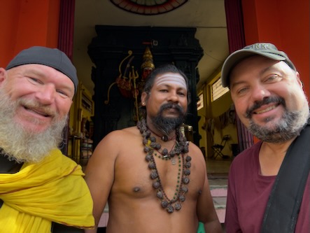 Am Vormittag haben wir zunächst das Viertel rund um unser Hotel zu Fuß erkundet, haben ein paar kleinere Tempel zwischen den Wohn- und Geschäftshäusern entdecket und wurden von einem Priester in seinen Kali-Tempel hineingebeten. Er hat uns dann sogar zwei Banane geschenkt! Viele andere Passanten haben uns wie üblich angesprochen und wollten wie immer wissen, woher wir kommen, wie lange wir bleiben, was uns am besten gefallen hat und Fotos zusammen machen… | ![]() |