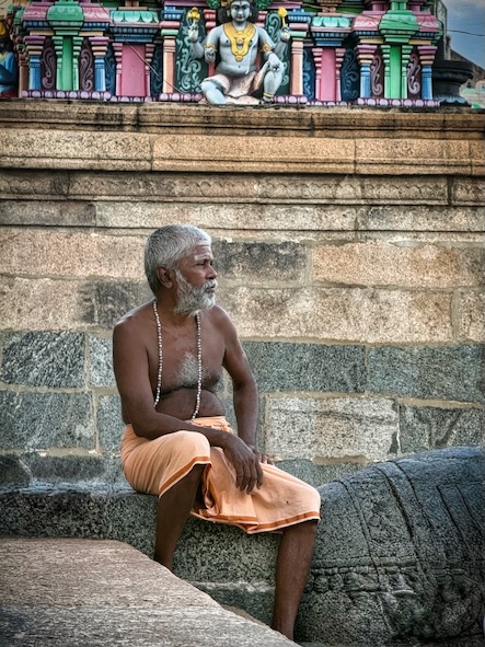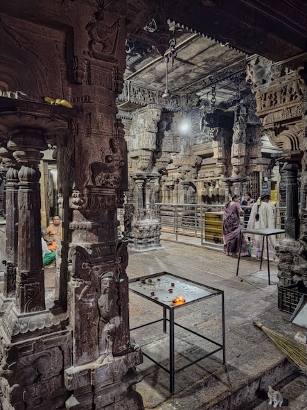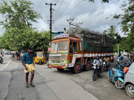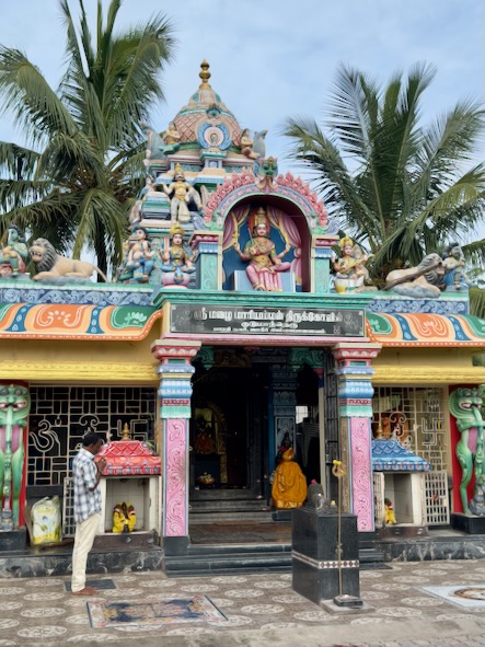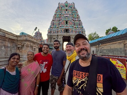 Danach sind wir wieder in die Stadt zurück und haben - wie versprochen - Fahith in seinem Laden besucht. Fahith ist 28 Jahre alt und war Englischlehrer, bevor er sich selbstständig gemacht hat. Seine Mutter arbeitet als Lehrerin für Geschichte an einer kleinen Schule, in einem Dorf, etwa 30 Minuten ausserhalb der Stadt. Nachdem wir unentgeltlich mit Getränken und seinem Laden versorgt worden sind, hat er gefragt, ob wir ihn begleiten möchten, wenn er seine Mutter von der Arbeit abholt. Wir haben da natürlich sofort gern zugesagt. Zunächst hat er uns aber noch das Haus und seine Wohnung gezeigt, und dann ging’s mit dem Auto raus aufs Land. Die Schüler waren zwar leider schon alle weg, aber es warteten Fahiths Mutter, eine Kollegin und die Schuldirektorin auf uns und zeigten uns die Klassenzimmer. Die junge Lehrerin unterrichtet Tamil und betreibt auch einen erfolgreichen YouTube-Kanal. Fahith hat uns, seine Mutter und ihre Kollegin dann zu einem Café gebracht und dort wurden wir zu Kuchen und einem typischen Soda-Getränk mit dem traditionellem Glaskugelverschluß eingeladen. Dann ging’s noch zu einem kurzen Besuch zu einem der ältesten Tempel des Gegend, zum Arulmigu Kailasanathar Tempel. Dort kam dann noch ein weiterer Freund Fahiths hinzu, der uns auch kennenlernen wollte. Danach gabs noch einen kleinen Snack in einem Restaurant und dann haben wir die Kollegin von Fahiths Mutter nach Hause gebracht, wo diese uns dann unbedingt noch ihrem 13-jährigen Sohn vorstellen wollte. Wieder in der Stadt zurück, haben wir uns für heute verabschiedet und sind schon sehr gespannt auf die Aktion morgen in der Schule! Für uns ist das immer alles unvorstellbar, aber diese Leute haben eine richtige Freude daran, Zeit mit zwei Touristen aus Deutschland zu verbringen, und dafür zu sorgen, das wir eine schone Zeit in Indien haben! | ![]() |