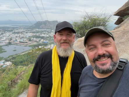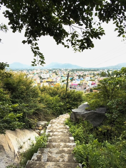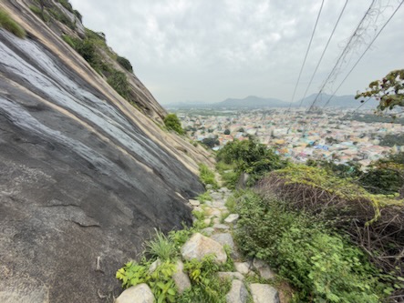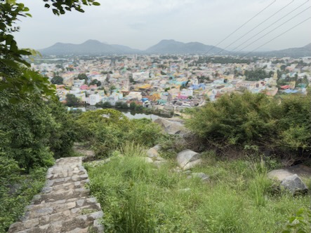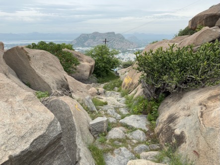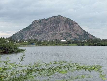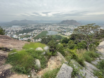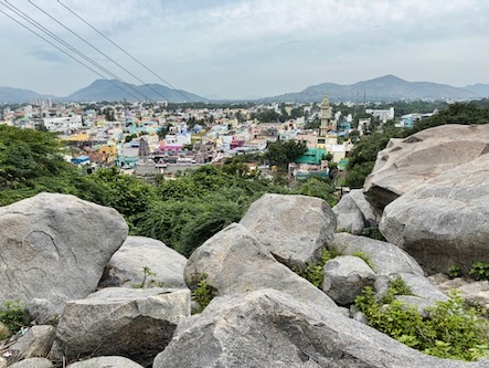 Nach einem Frühstück im Hotel sind wir zu dem markanten Granitfelsen gefahren, der über der Stadt thront. Oben auf dem Gipfelplateau befindet sich die Ruine des Krishnagiri Forts, einer Festungsanlage aus dem 10ten Jahrhundert. Der Berg selbst ist auch als Sayed Basha Hill bekannt, weil oben in einem Grab die Überreste des Sufi-Heiligen Sayed Basha ruhen. Einheimische Muslime pilgern daher gerne auf diesen Berg, obwohl der Aufstieg nicht gerade leicht und ungefährlich ist. Zum Glück war es heute aber etwas bedeckt, perfektes Wetter für unseren Aufstieg! Die erste Hälfte führen noch Stufen hinauf, danach folgen Granitbrocken über die man klettern muss. An einigen Stellen wurden Trittkerben in die Felsplatten gehauen. Auf halber Strecke hat uns dann ein Einheimischer überholt, der uns erklärte, dass er für gut eine Woche jeden Morgen hinauf klettert und am Abend wieder zurück, um oben Gartenarbeiten zu erledigen. Vermutlich wucherndes Gestrüpp entfernen. Er hatte auch gewarnt, dass wir vorsichtig seien sollen, da sich unter den Steinen sehr viele Schlangen verstecken würden! Wir haben jedenfalls keine gesehen und sind wohlbehalten oben angekommen, haben eine schöne Aussicht über die Stadt gehabt und sind dann nach kurzer Pause wieder nach unten geklettert. Der Aufstieg hat etwa eineinhalb Stunden gedauert, ebenso der Abstieg.