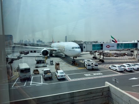 Am zweiten Tag unserer Reise sind wir ja am frühen Morgen Ortszeit in Dubai angekommen. Dort mussten wir 6 Stunden auf unseren Anschlußflug warten. Um 13:35 Uhr ging es dann schließlich mit erin Boeing 777-300 weiter nach Bangalore, wo wir nach rund dreieinhalb Stunden in der Dämmerung landeten.