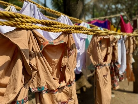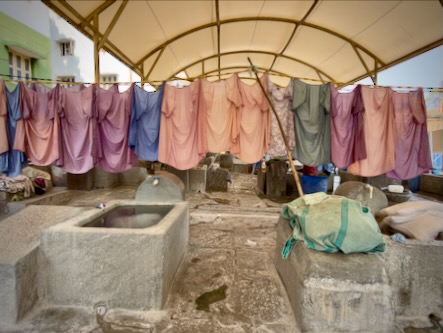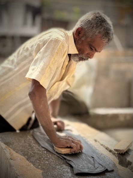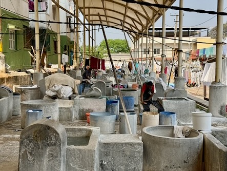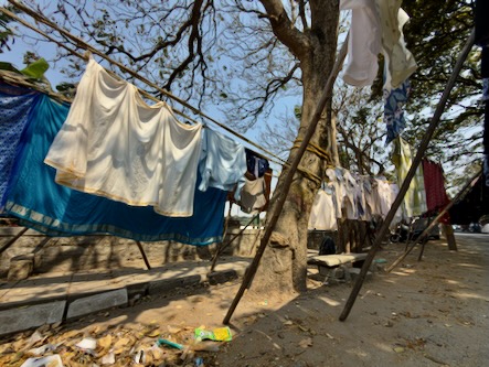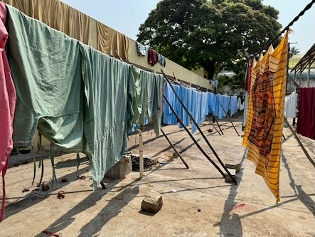 Schon auf dem Weg dorthin wurden wir von einer der vielen kleinen Überraschungen des Alltags in Indien überrascht. Zufällig entdeckten wir eine traditionelle Wäscherei. Dort wurde die Kleidung noch auf ganz ursprüngliche Weise gewaschen: in großen Waschtrögen, mit kräftigen Schlägen auf glatten Steinen, so wie es hier schon seit Generationen gemacht wird. Überall entlang der Straßen spannten sich lange Leinen, auf denen bunte Hemden, Arbeitskleidung, Uniformen und Tücher in der warmen Sonne trockneten – ein lebendiges Bild, das fast wie eine kleine Freiluftgalerie wirkte.