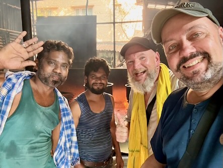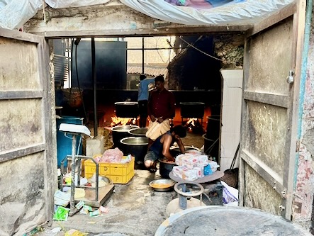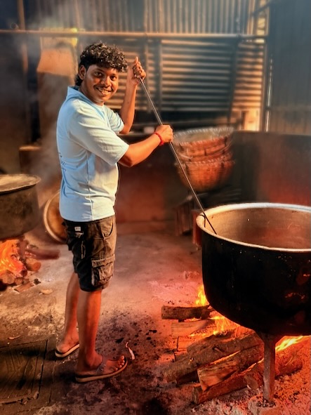 Ein ganz besonderes Erlebnis erwartete uns wenig später: Wir stießen erneut auf eine dieser beeindruckenden „Großküchen“, in denen über offenen Feuerstellen riesige Kessel mit duftendem Biryani zubereitet wurden. Die Hitze war intensiv, der Rauch lag schwer in der Luft – und dennoch wurden wir eingeladen, näherzukommen. Mitten im Geschehen durften wir einen Blick in die glühend heiße Küche werfen und die Mitarbeiter fotografieren.