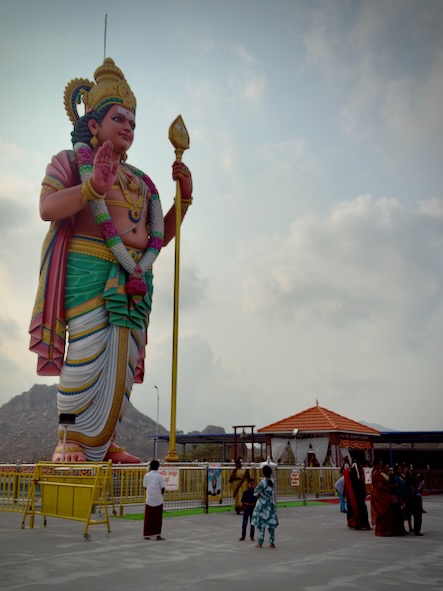 Unser erstes Ziel war das Dorf Annamalaiyar, wo uns der beeindruckende Sri Theerthagiri Vadivel Subramaniya Tempel erwartete. Besonders faszinierend war die gewaltige, 28 Meter hohe Statue des Gottes Muruga, die schon von weitem sichtbar ist und eine ganz besondere spirituelle Atmosphäre ausstrahlt. Muruga – oft auch Kartikeya, Skanda oder Subramanya genannt – ist eine der wichtigsten Gottheiten im südindischen Hinduismus, besonders in Tamil Nadu. Er gilt als Gott des Krieges, des Sieges, der Weisheit und der Jugend. Muruga ist der Sohn von Shiva und Parvati. Der Legende nach wurde er erschaffen, um den Dämon Surapadman zu besiegen und so die kosmische Ordnung wiederherzustellen. Deshalb wird er oft als mutiger Krieger dargestellt, der für das Gute kämpft. In Tamil Nadu ist Muruga besonders tief im Alltag und in der Kultur verwurzelt. Viele Tempel sind ihm gewidmet, und er wird von Millionen Menschen verehrt. Einer der bekanntesten Feste zu seinen Ehren ist Thaipusam, bei dem Gläubige oft aufwendige Rituale und Pilgerreisen unternehmen.