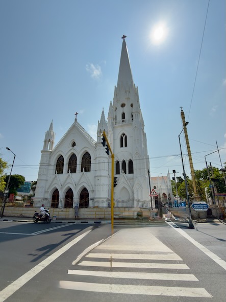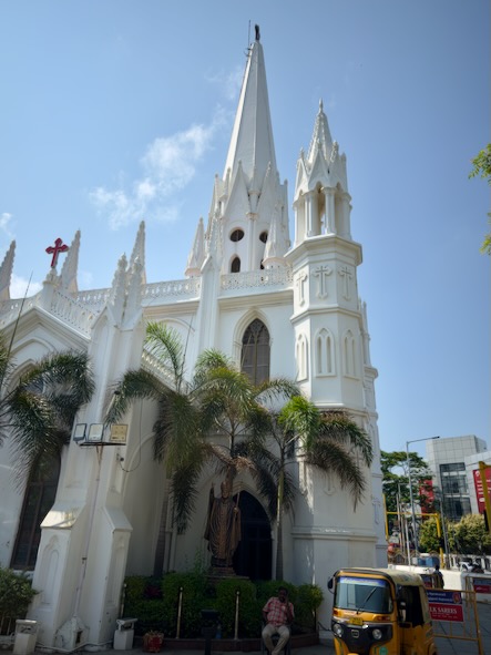Unser Ziel war das Chennai Lighthouse, das seit 1977 mit seinen 46 Metern Höhe über die Küste wacht. Von dort aus ließen wir den Strand hinter uns und tauchten wieder in das geschäftige Stadtleben ein, bis wir schließlich die beeindruckende San Thome Basilica erreichten. Sie soll über dem Grab von Thomas the Apostle stehen, der der Legende nach bereits im Jahr 52 n. Chr. nach Indien kam. Die strahlend weiße Kirche, ursprünglich im 16. Jahrhundert von den Portugiesen erbaut und später im neugotischen Stil erweitert, wirkte wie ein ruhiger Gegenpol zur lauten Stadt.