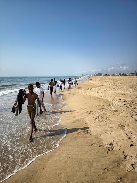 Wir starteten unseren Tag im geschäftigen Stadtteil George Town und machten uns von dort aus auf den Weg zum Meer. Am nördlichen Ende des Marina Beach begannen wir unseren langen Spaziergang Richtung Süden. Der über 13 Kilometer lange Strand zählt zu den längsten urbanen Stränden der Welt – und genau so fühlte es sich auch an: endlos, lebendig und voller Eindrücke.