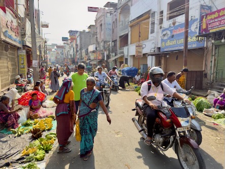 Unser zweiter Tag in Salem begann – ganz typisch für uns – recht früh. Es ging in den Stadtteil Agraharam, wo uns der örtliche Gemüsemarkt begeistert hat. Die Händler: bestens gelaunt, extrem gesprächig und offenbar große Fans der Kamera. Es wurde gelacht, posiert und viele wollten ein Foto.