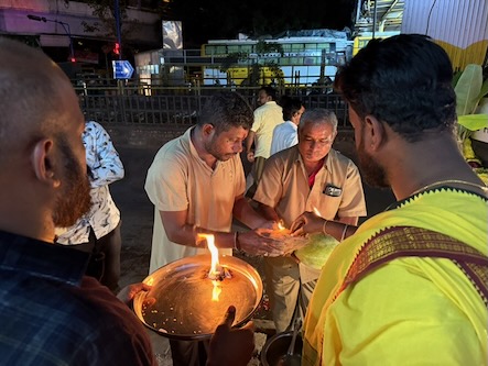 Nachdem wir uns heute Mittag noch etwas von der langen Anreise erholen musste, konnten wir es uns doch nicht nehmen lassen, einmal am frühen Nachmittag und dann noch einmal am Abend den Stadtteil rund um unser Hotel zu erkunden. Bengaluru (offizieller Name seit 2014, zuvor englisch Bangalore) ist die Hauptstadt des indischen Bundesstaates Karnataka, im Süden des Landes. Sie hat etwa 13,2 Millionen Einwohner und ist somit nach Delhi, Mumbai und Kolkata die viertgrößte Stadt Indiens. Schon am Nachmittag ist uns aufgefallen, dass sämtliche Tuktuks aber auch viele Busse und Lastwägen mit Blättern der Bananenstaude geschmückt sind und überall in der Stadt zerschlagene Kokosnüsse und Melonen auf den Straßen lagen. Am 1. Oktober 2025 findet in Indien das hinduistische Fest Ayudha Puja statt. An diesem Tag werden traditionell Werkzeuge, Maschinen und Fahrzeuge gesegnet, weil sie als Hilfsmittel des täglichen Lebens gelten. In vielen Regionen Indiens schmücken Menschen daher ihre Autos, Motorräder, Rikshas, Busse oder auch Lastwagen mit Blumen, bunten Tüchern und manchmal sogar Farbpulver (Rangoli). Priester oder Familien sprechen Segensgebete, und oft wird auch eine Kokosnuss oder ähnliches vor dem Fahrzeug geopfert. Die Tradition ist teil des Es ist Teil des Navaratri-Festes, das Göttin Durga und ihre verschiedenen Aspekte ehrt. |