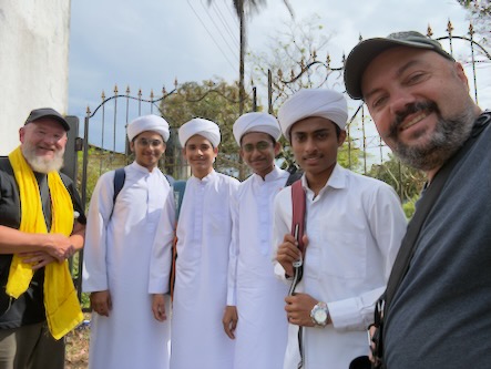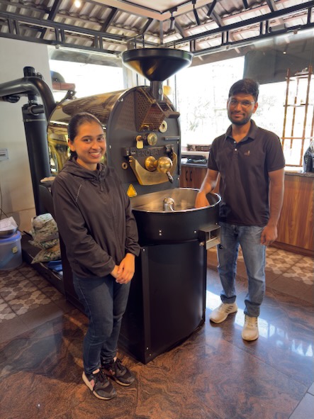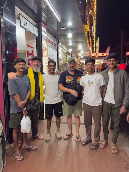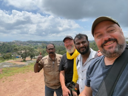 Danach ging es nochmals ein paar Kilometer ausserhalb der Stadt zur Kaffeeplantage „Sandalkad Estates“. Da wir an dem heutigen Vormittag offensichtlich die einzigen Besucher dort waren, machte einer der Mitarbeiter mit uns alleine eine etwa einstündige Führung über das Plantagengelände, zeigte uns die Kaffepflanzen, Gewürzpflanzen und die technischen Geräte zum Aufbereiten der Kaffeekirschen etc. Ein Jeep brachte uns am Ende der Führung zurück zum Hauptgebäude, wo wir zufällig auf den Besitzer der Plantage, Shamveel Nizam, stießen. Dort realisierten wir, dass er auch der Eigentümer vom „Big Cup Café“ ist und dort der Kaffee von seiner Plantage geröstet und ausgeschenkt wird. Auch mit ihm hatten wir ein sehr informatives Gespräch und er hat sich viel Zeit für uns genommen und uns persönlich eine besondere Kaffeerarität von Hand gemahlen und von Hand aufgebrüht! Am Abend haben wir dann in einem Reisebüro noch ein Auto für unsere Fahrt übermorgen von Madikeri nach Kochi gebucht und sind zum Abendessen gegangen. Auf dem Weg zurück zum Hotel hat uns eine Gruppe von Studenten aus Maharashtra angesprochen, die auch gerade in Südindien herumreisen. Wir hatten ein nettes Gespräch, mussten Kontakten austauschen und die obligatorischen Fotos machen! ![]() |