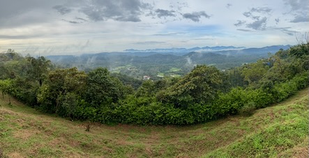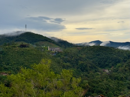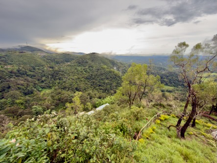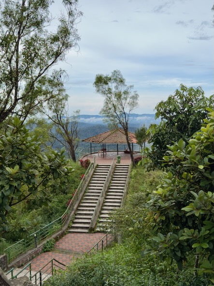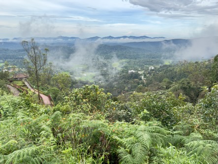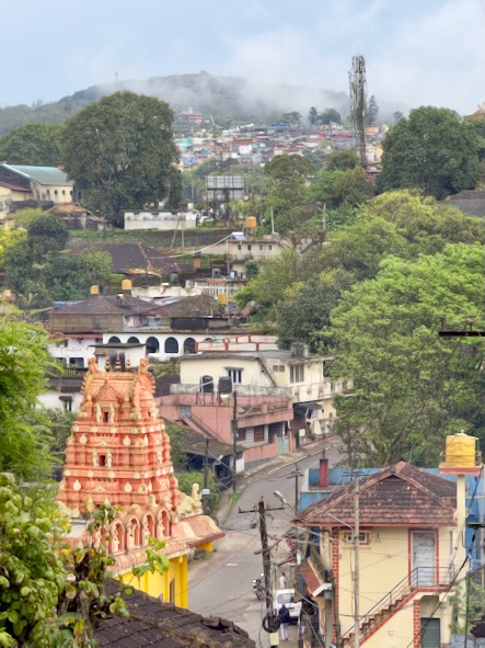 An unserem letzten Tag in Madikeri, sind wir am frühen Morgen losgezogen und sind bis zum Raja’s Seat spaziert. Dies ist eine Parkanlage auf einem der Hügel, die die Stadt umgeben und von dort hat man eine schöne Fernsicht über die üppig bewaldeten Berge in der Region Coorg. Am Morgen war es noch nebelig-feucht, mit zunehmender Sonneneinstrahlung wurde es schwül-warm. | ![]() |
