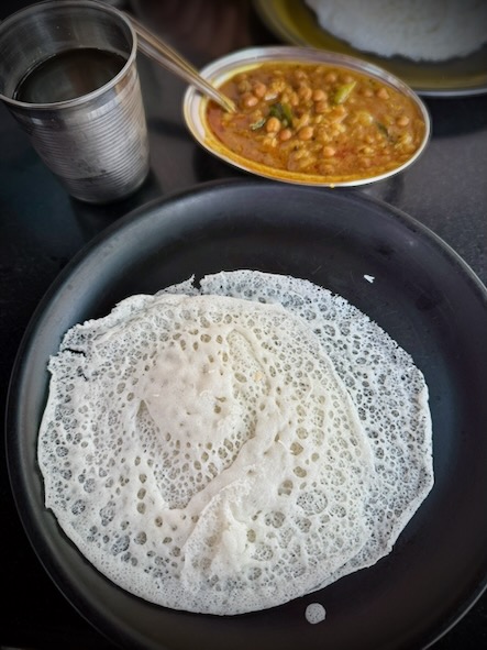 Nach der Besichtigung der Wäscherei sind wir in eine der kleinen Lokale, um zu Frühstücken. Wie hier üblich gab es Appam mit Kichererbsen-Curry und Kaffee.