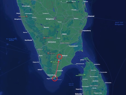 Für die 300 Kilometer lange Strecke benötigte der Zug etwas mehr als 5 Stunden. Die Fahrt ging zunächst Richtung Süden, nach Nagercoil, also fast bist zur südlichsten Spitze Indiens und dem südlichsten Punkt unserer Reise. Dann macht die Strecke eine Kurve und führt nach Norden, bis nach Madurai.