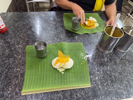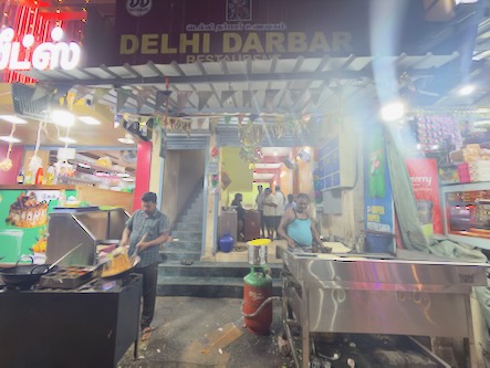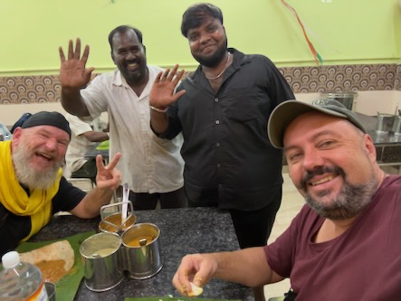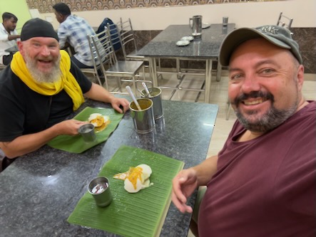 Ein Nachtrag zum gestrigen Abend: Nachdem wir unseren gestrigen Bericht hochgeladen hatte, sind wir nochmals rausgegangen, um etwas zu essen. Wir hatten keine Ahnung, wie sich der Abend dann noch entwickeln würde. Zunächst waren wir in einem kleinen Lokal, gleich um die Ecke unseres Hotels. Die Mitarbeiter dort waren sehr lustig und haben uns einfach aufgetischt, was die Küche hergab. Wir hatten keine Auswahlmöglichkeit, es gab Idli mit Sambar und Dosa mit Sambar und Chutney. | ![]() |