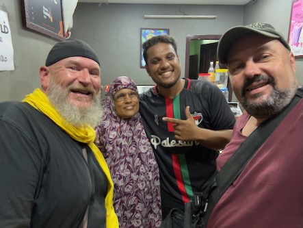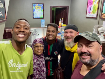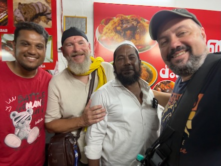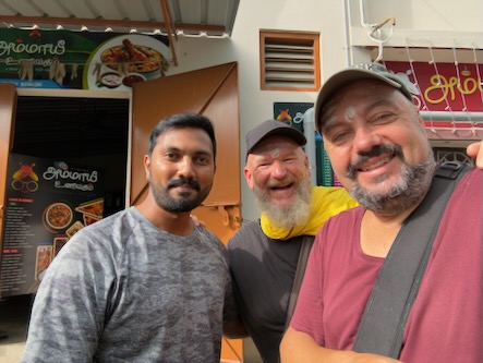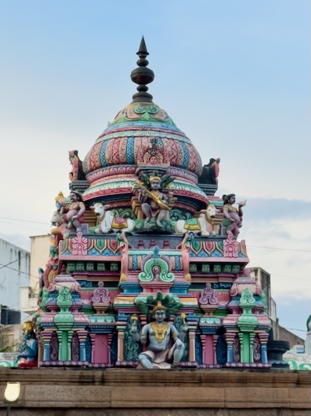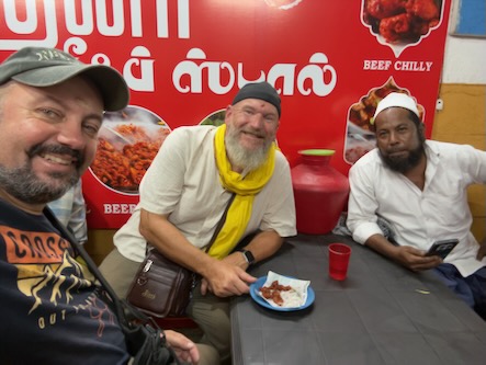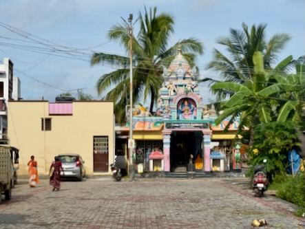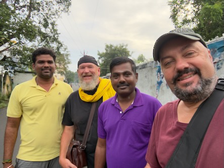 Danach sind wir wieder in die Stadt zurück und haben - wie versprochen - Fahith in seinem Laden besucht. Fahith ist 28 Jahre alt und war Englischlehrer, bevor er sich selbstständig gemacht hat. Seine Mutter arbeitet als Lehrerin für Geschichte an einer kleinen Schule, in einem Dorf, etwa 30 Minuten ausserhalb der Stadt. Nachdem wir unentgeltlich mit Getränken und seinem Laden versorgt worden sind, hat er gefragt, ob wir ihn begleiten möchten, wenn er seine Mutter von der Arbeit abholt. Wir haben da natürlich sofort gern zugesagt. Zunächst hat er uns aber noch das Haus und seine Wohnung gezeigt, und dann ging’s mit dem Auto raus aufs Land. Die Schüler waren zwar leider schon alle weg, aber es warteten Fahiths Mutter, eine Kollegin und die Schuldirektorin auf uns und zeigten uns die Klassenzimmer. Die junge Lehrerin unterrichtet Tamil und betreibt auch einen erfolgreichen YouTube-Kanal. Fahith hat uns, seine Mutter und ihre Kollegin dann zu einem Café gebracht und dort wurden wir zu Kuchen und einem typischen Soda-Getränk mit dem traditionellem Glaskugelverschluß eingeladen. Dann ging’s noch zu einem kurzen Besuch zu einem der ältesten Tempel des Gegend, zum Arulmigu Kailasanathar Tempel. Dort kam dann noch ein weiterer Freund Fahiths hinzu, der uns auch kennenlernen wollte. Danach gabs noch einen kleinen Snack in einem Restaurant und dann haben wir die Kollegin von Fahiths Mutter nach Hause gebracht, wo diese uns dann unbedingt noch ihrem 13-jährigen Sohn vorstellen wollte. Wieder in der Stadt zurück, haben wir uns für heute verabschiedet und sind schon sehr gespannt auf die Aktion morgen in der Schule! Für uns ist das immer alles unvorstellbar, aber diese Leute haben eine richtige Freude daran, Zeit mit zwei Touristen aus Deutschland zu verbringen, und dafür zu sorgen, das wir eine schone Zeit in Indien haben! | ![]() |