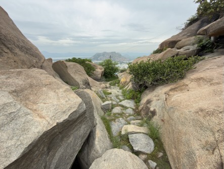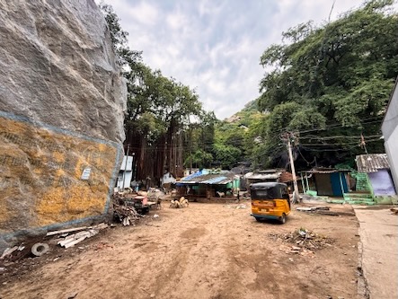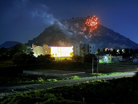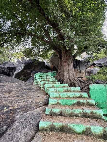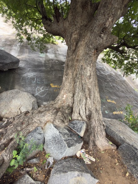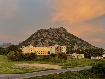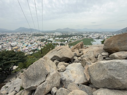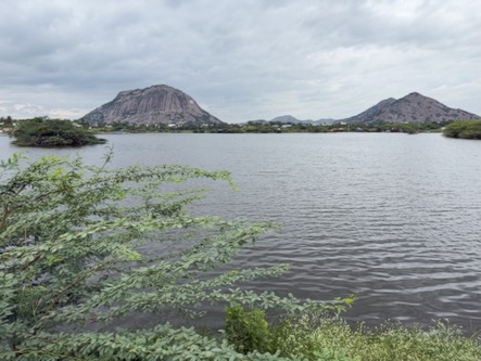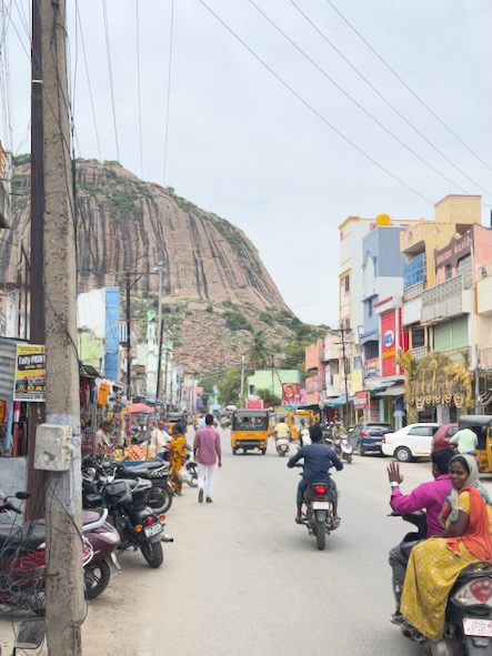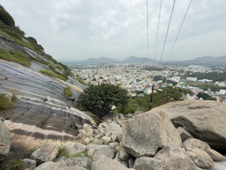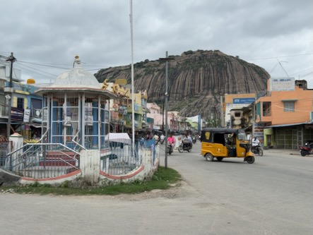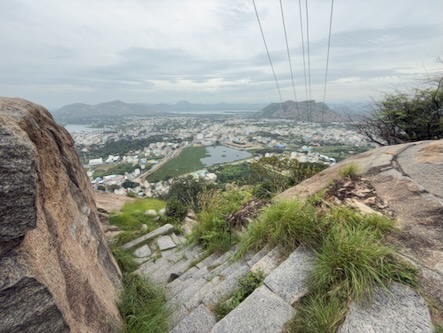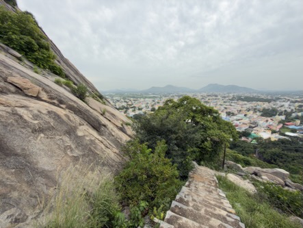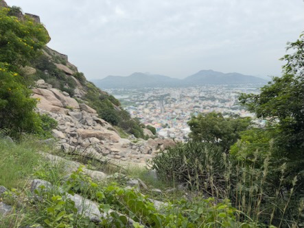 Nach einem Frühstück im Hotel sind wir zu dem markanten Granitfelsen gefahren, der über der Stadt thront. Oben auf dem Gipfelplateau befindet sich die Ruine des Krishnagiri Forts, einer Festungsanlage aus dem 10ten Jahrhundert. Der Berg selbst ist auch als Sayed Basha Hill bekannt, weil oben in einem Grab die Überreste des Sufi-Heiligen Sayed Basha ruhen. Einheimische Muslime pilgern daher gerne auf diesen Berg, obwohl der Aufstieg nicht gerade leicht und ungefährlich ist. Zum Glück war es heute aber etwas bedeckt, perfektes Wetter für unseren Aufstieg! Die erste Hälfte führen noch Stufen hinauf, danach folgen Granitbrocken über die man klettern muss. An einigen Stellen wurden Trittkerben in die Felsplatten gehauen. Auf halber Strecke hat uns dann ein Einheimischer überholt, der uns erklärte, dass er für gut eine Woche jeden Morgen hinauf klettert und am Abend wieder zurück, um oben Gartenarbeiten zu erledigen. Vermutlich wucherndes Gestrüpp entfernen. Er hatte auch gewarnt, dass wir vorsichtig seien sollen, da sich unter den Steinen sehr viele Schlangen verstecken würden! Wir haben jedenfalls keine gesehen und sind wohlbehalten oben angekommen, haben eine schöne Aussicht über die Stadt gehabt und sind dann nach kurzer Pause wieder nach unten geklettert. Der Aufstieg hat etwa eineinhalb Stunden gedauert, ebenso der Abstieg.