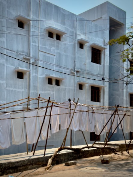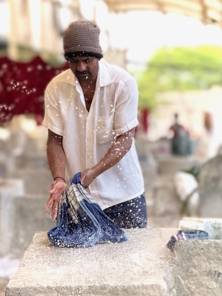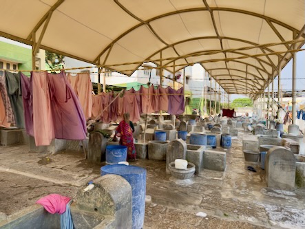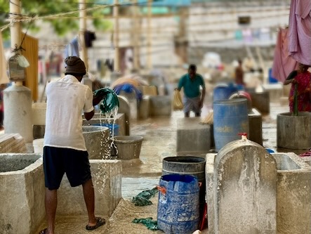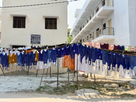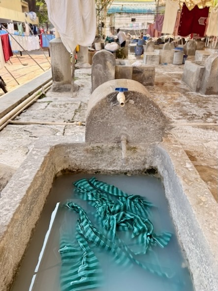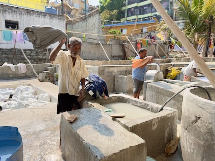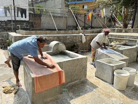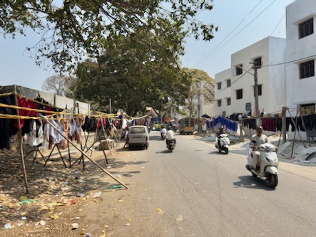 Schon auf dem Weg dorthin wurden wir von einer der vielen kleinen Überraschungen des Alltags in Indien überrascht. Zufällig entdeckten wir eine traditionelle Wäscherei. Dort wurde die Kleidung noch auf ganz ursprüngliche Weise gewaschen: in großen Waschtrögen, mit kräftigen Schlägen auf glatten Steinen, so wie es hier schon seit Generationen gemacht wird. Überall entlang der Straßen spannten sich lange Leinen, auf denen bunte Hemden, Arbeitskleidung, Uniformen und Tücher in der warmen Sonne trockneten – ein lebendiges Bild, das fast wie eine kleine Freiluftgalerie wirkte.