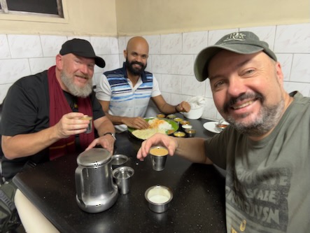 Anschließend warteten wir auf unseren Freund Dilip, der mit dem Zug aus Bangalore angereist war, um die nächsten Tage gemeinsam mit uns zu verbringen. Als er schließlich ankam, wurde das Wiedersehen zunächst mit einem Mittagessen und einem guten Kaffee gefeiert.