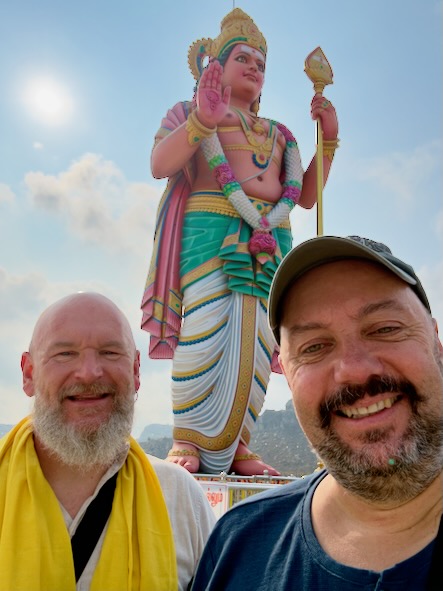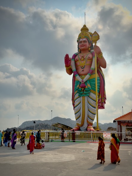 Unser erstes Ziel war das Dorf Annamalaiyar, wo uns der beeindruckende Sri Theerthagiri Vadivel Subramaniya Tempel erwartete. Besonders faszinierend war die gewaltige, 28 Meter hohe Statue des Gottes Muruga, die schon von weitem sichtbar ist und eine ganz besondere spirituelle Atmosphäre ausstrahlt. Muruga – oft auch Kartikeya, Skanda oder Subramanya genannt – ist eine der wichtigsten Gottheiten im südindischen Hinduismus, besonders in Tamil Nadu. Er gilt als Gott des Krieges, des Sieges, der Weisheit und der Jugend. Muruga ist der Sohn von Shiva und Parvati. Der Legende nach wurde er erschaffen, um den Dämon Surapadman zu besiegen und so die kosmische Ordnung wiederherzustellen. Deshalb wird er oft als mutiger Krieger dargestellt, der für das Gute kämpft. In Tamil Nadu ist Muruga besonders tief im Alltag und in der Kultur verwurzelt. Viele Tempel sind ihm gewidmet, und er wird von Millionen Menschen verehrt. Einer der bekanntesten Feste zu seinen Ehren ist Thaipusam, bei dem Gläubige oft aufwendige Rituale und Pilgerreisen unternehmen.