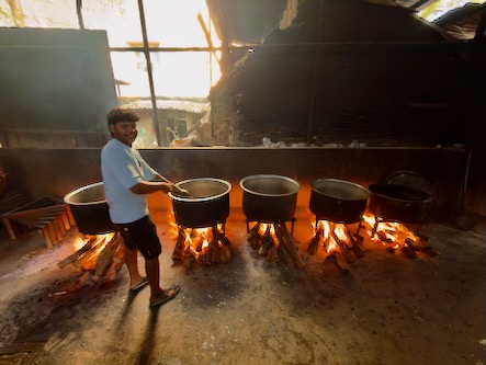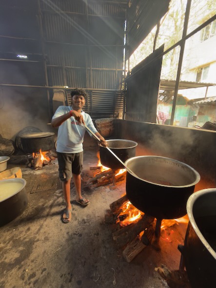 Ein ganz besonderes Erlebnis erwartete uns wenig später: Wir stießen erneut auf eine dieser beeindruckenden „Großküchen“, in denen über offenen Feuerstellen riesige Kessel mit duftendem Biryani zubereitet wurden. Die Hitze war intensiv, der Rauch lag schwer in der Luft – und dennoch wurden wir eingeladen, näherzukommen. Mitten im Geschehen durften wir einen Blick in die glühend heiße Küche werfen und die Mitarbeiter fotografieren.