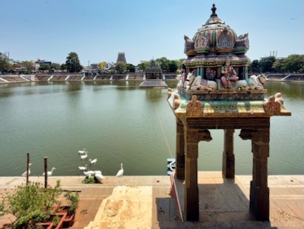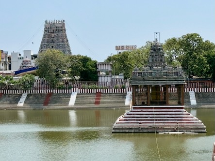 Frisch gestärkt zog es uns weiter in den historischen Stadtteil Mylapore zum Kapaleeshwarar Temple. Der Tempel ist Shiva gewidmet und gehört zu den ältesten und lebendigsten Orten der Stadt. Schon von weitem beeindruckte uns der farbenprächtige Gopuram, geschmückt mit unzähligen Figuren aus der hinduistischen Mythologie.