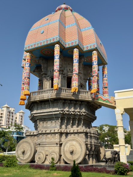 Schon beim Näherkommen wurde uns die besondere Ausstrahlung dieses Ortes bewusst. Im Zentrum des Komplexes erhebt sich ein gewaltiger steinerner Tempelwagen, ein sogenannter Chariot, der an die prächtigen Festwagen südindischer Tempel erinnert. Mit seinen rund 39 Metern Höhe wirkt er fast monumental – still, kraftvoll und voller kultureller Bedeutung.