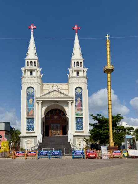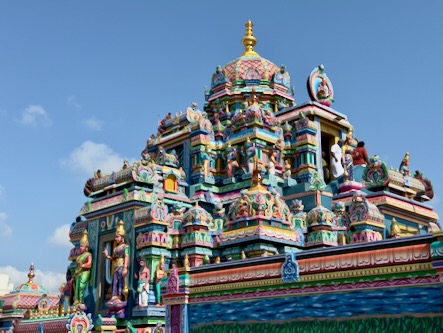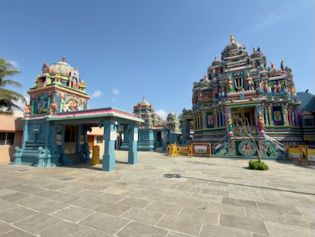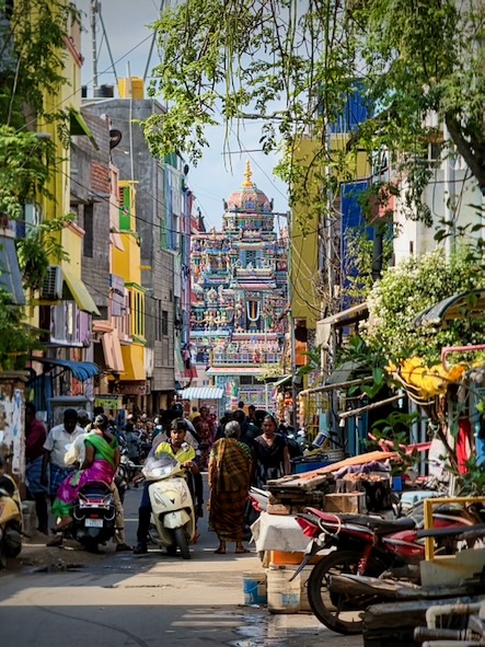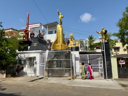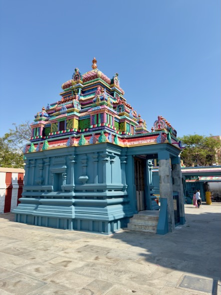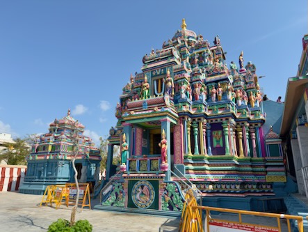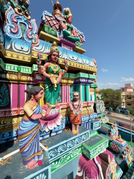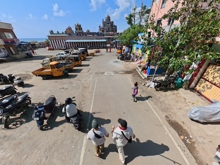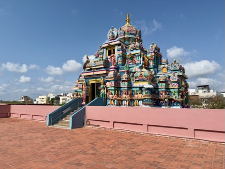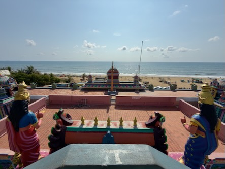 Vom Strand aus liefen wir weiter nach Süden, immer entlang der Küste. Zwischendurch gönnten wir uns frisches Obst und einen heißen Chai. Unser Weg führte uns vorbei am Annai Velankanni Shrine, dessen weiße Fassade ruhig in der Morgensonne leuchtete, bis wir schließlich den farbenfrohen Shri Ashtalakshmi Temple erreichten.