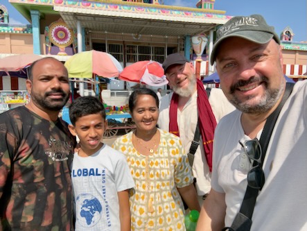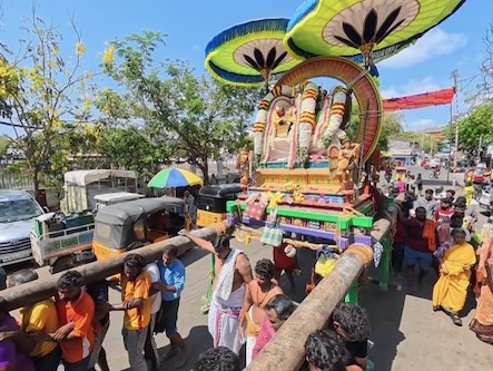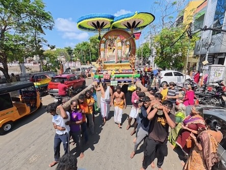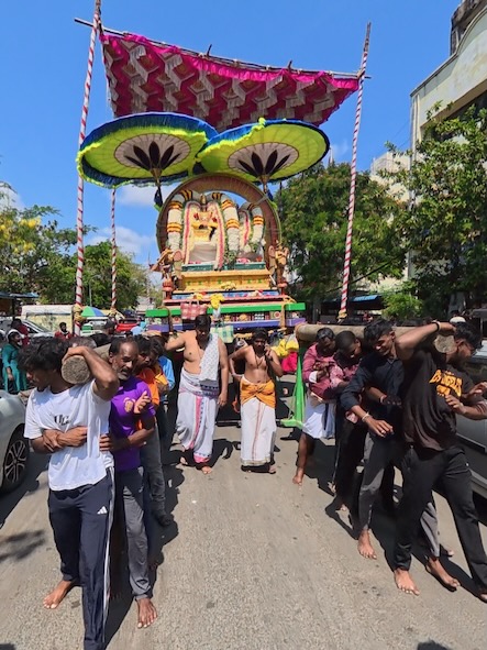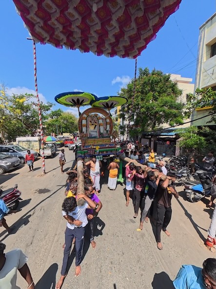 Und wiederum ein paar Meter weiter, gerieten wir unvermittelt in eine hinduistische Prozession: Mehrmals täglich, über mehrere Tage hinweg, werden kunstvoll geschmückte Darstellungen von Göttern auf schweren Tragen und Wagen rund um den Tempel und den Teich getragen. Zahlreiche Männer bewegten sie im Rhythmus von Nagaswaram (dem Typischen Blasinstrument in Tamil Nadu) und Trommeln – ein eindrucksvolles, lebendiges Schauspiel voller Energie und Hingabe.