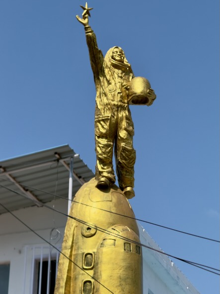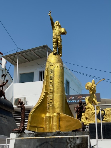 Auf dem Weg dorthin, haben wir in einem Vorgarten ein paar auffallende Skulpturen entdecket - eine da von entpuppte sich bei genauerer Betrachtung als Denkmal an Kalpana Chawla, die erste Astronautin indischer Herkunft. Sie wurde 1962 in Karnal geboren und wanderte später in die USA aus. Dort wurde sie Ingenieurin und schließlich Astronautin bei der NASA. Sie war die erste Frau indischer Herkunft im All. Tragischerweise kam sie beim Space Shuttle Columbia Disaster ums Leben, als die Raumfähre beim Wiedereintritt in die Erdatmosphäre zerbrach.