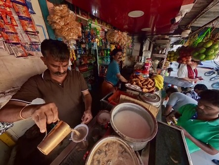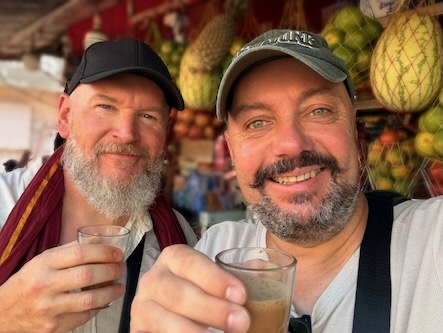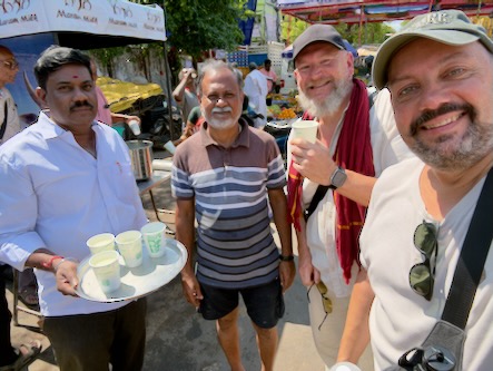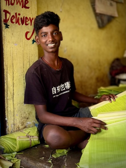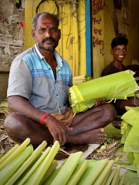 Etwas weiter Richtung Tempel, kamen zufällig an einem Stand vorbei, bei dem wir kostenlos Buttermilchprodukte verkosten durften. Die Herren, die uns das Getränk spendierten, wollten dann auch genau wissen, wie uns ihr neues Produkt schneckt. Das obligatorische Selfie durfte dann natürlich auch nicht fehlen. Gleich nebenan, war eine kleine Werkstatt, in der Bananenblätter zurechtgeschnitten werden, die dann - wie im Süden Indiens üblich - an Stelle von Tellern für das Essen verwendet wird.