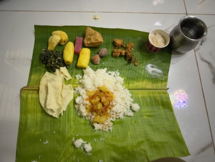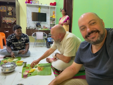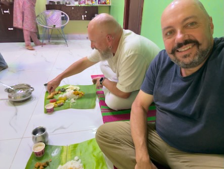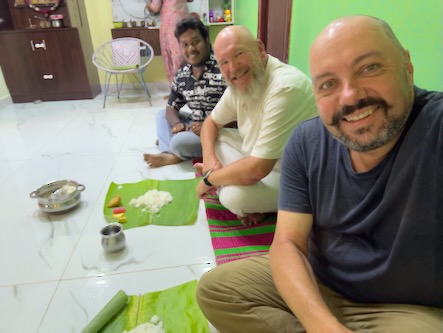 Dort wurden wir bereits erwartet: Auch die Schwiegermutter war extra angereist, um uns kennenzulernen – ein Zeichen der Wertschätzung, das uns tief berührte. Zunächst führten sie uns stolz durch ihr Zuhause, bevor wir gebeten wurden, auf dem Boden Platz zu nehmen – ganz traditionell. Wenig später wurde vor uns ein Festmahl angerichtet: eine Vielzahl an südindischen Spezialitäten, liebevoll serviert auf einem frischen Bananenblatt. Die Farben, die Düfte, die Aromen – alles war intensiv, authentisch und voller Hingabe zubereitet.